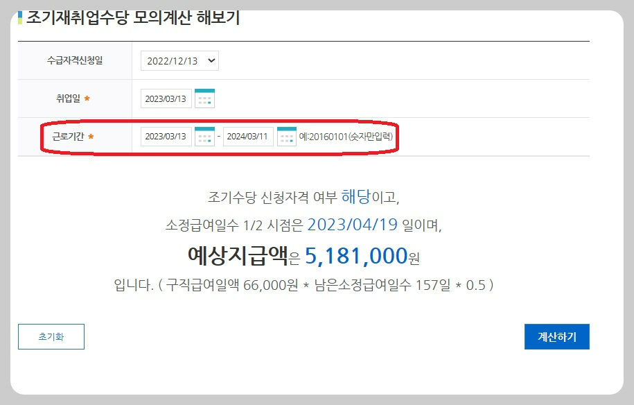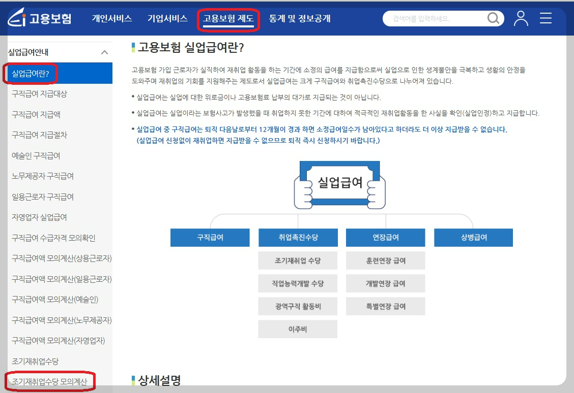 고용보험 홈페이지> 고용보험제도> 실업급여안내> 실업급여란?> 조기채쥐업수당 모의계산하기