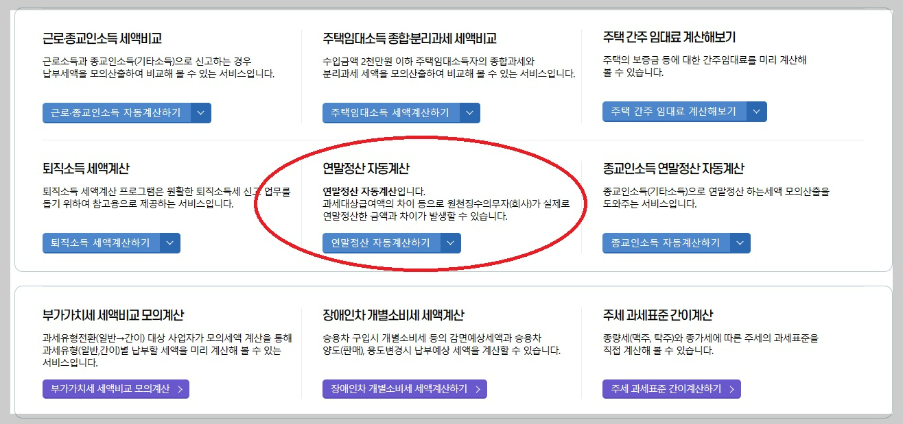 홈택스> 장려금, 연말정산 전자기부금> 편리한 연말정산> 근로자 연말정산 미리 보기> 모의계산> 연말정산 자동계산