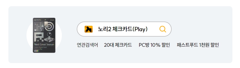 여가 혜택을 누리고 싶다면 kb 국민 노리2체크카드 play형은 브랜드나 가맹점 구분 없이 PC방이나 패스트푸드 업종이라면 PC방 10% 할인, 패스트푸드 1천 원을 할인제공합니다.