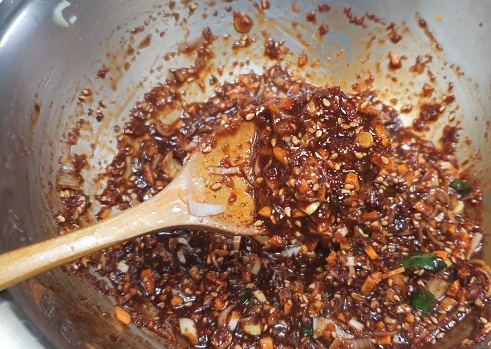 잘 저어주면 요렇게 꾸덕하고 반짝반짝 맛나는 양념장이 만들어집니다. 냄새만 맡아도 침이 넘어가요. 맛있는 양념장만 만들어도 벌써 요리가 다 끝난 기분이지만 꼬막을 삶아야 합니다.