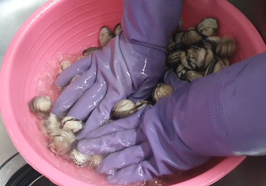 1.꼬막을 장갑을 낀 상태로 뽀드득 뽀드득 깨끗이 씻어주셔야 합니다.