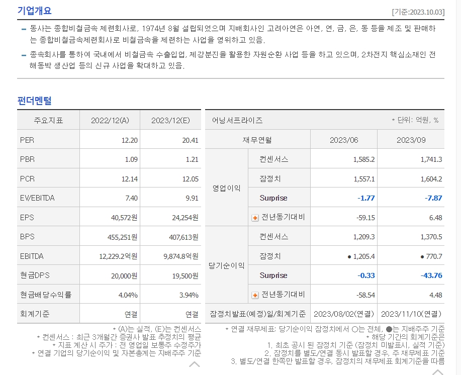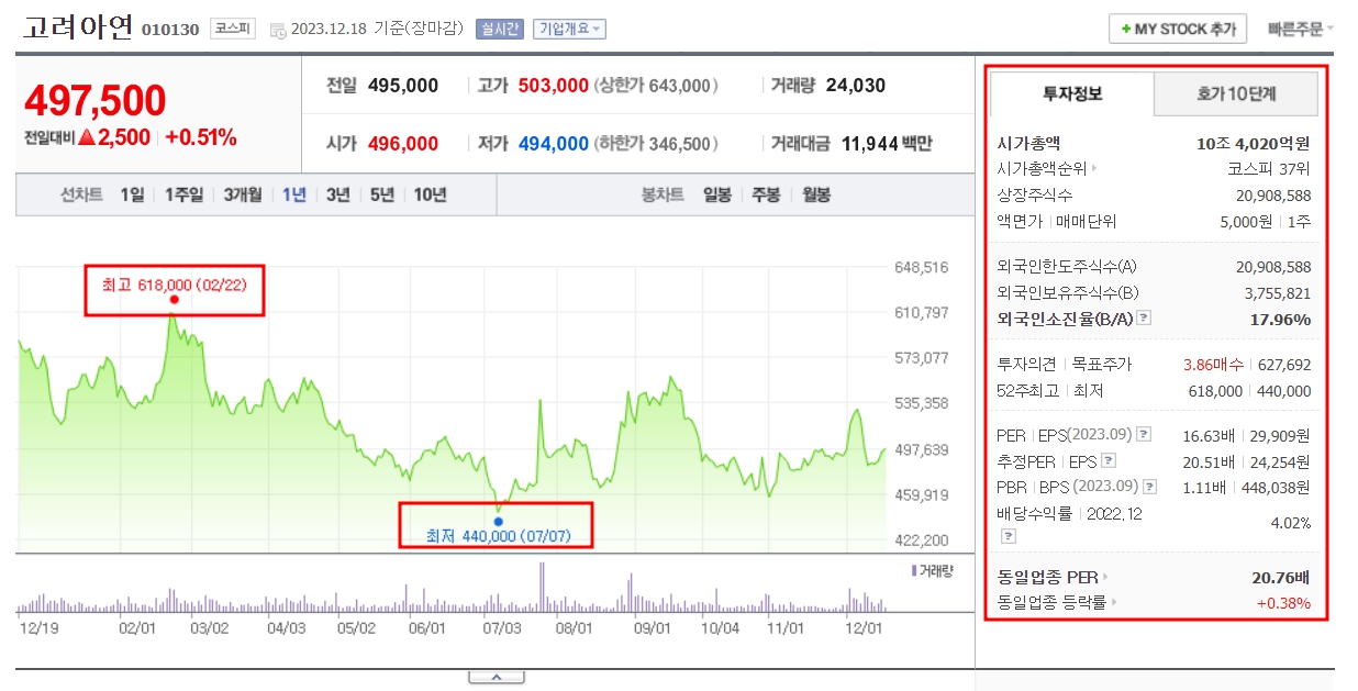 고려아연 주가 전망과 배당금 지급일에 대해서 알아보겠습니다. 주식 투자에서 핵심은 미래의 기업 가치를 예상하고 선제적으로 움직이는 것입니다. 투자 대상을 결정하기 전에 현재 기업의 현황과 수치를 검토하는 것이 필요합니다. 고려아연 주식의 주요 현황과 투자 정보를 확인하시고 주식 투자를 위한 유용한 자료들을 모아놓았으니 투자 시 참고하시면 도움이 될 것입니다.