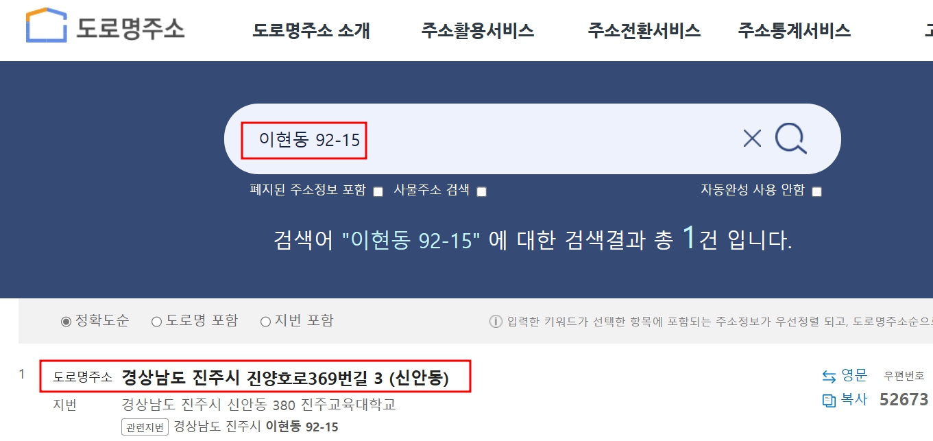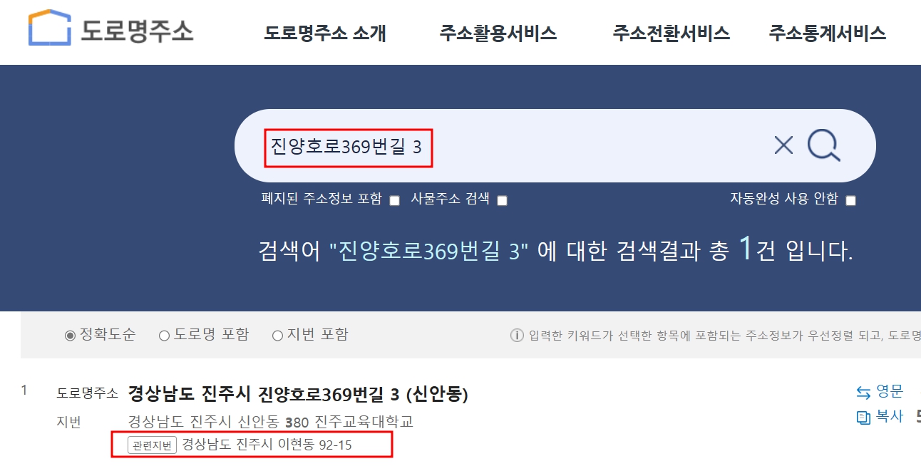 3. 도로명주소로 지번주소 찾기 변환합니다.