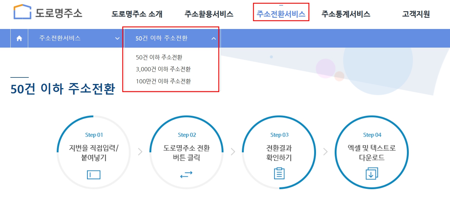 50건 이상의 기능을 한꺼번에 전환할때 사용하는 것이기 때문에 업무적으로 필요하신 분들이 사용하는 기능이랍니다. 3천 건 이하 주소 전화과 100만 건 이하 주소전환이 가능합니다. 지번을 직접 입력하여 전환하고 엑셀로 다운로드가 가능하니 업무적으로 유용하게 쓸 수 있습니다. 더 이상 주소 찾기 어렵게 찾아서 헤매지 마세요. 도로명주소 찾기 지번주소 찾기 변환 간단하게 끝 너무 쉽습니다.