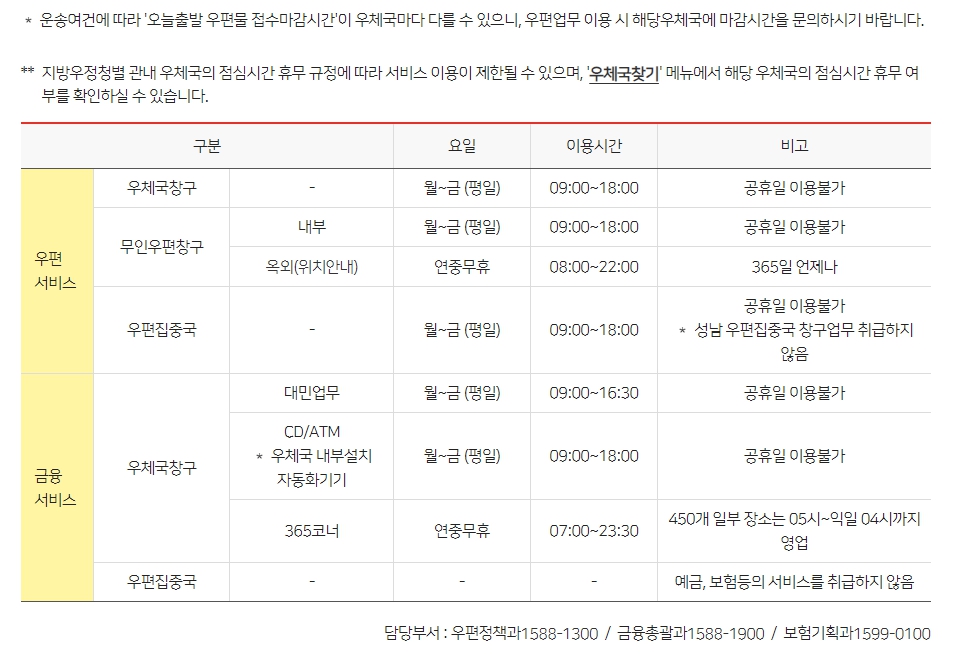 - 우체국 창구 서비스: 월요일부터 금요일까지 오전 9시부터 오후 6시까지 운영. 공휴일은 휴무입니다.
