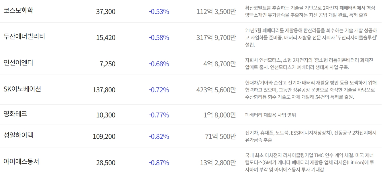 폐배터리 관련주가 일제히 동반상승하면서 2차 전지 기업이 주도하는 장세가 지속되고 폐배터리 관련주들도 주목을 받고 있습니다. 폐배터리 재활용은 전기차 배터리의 주요 금속을 추출하여 신규 배터리 제조에 사용하는 것을 말합니다. 전기차 배터리는 잔존수명이 80% 이하로 감소하면 주행거리 감소, 충전 속도 저하, 급속 방전 위험 등의 문제가 발생하기 때문에 교체가 불가피합니다.