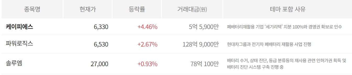 특히 올초 세기리텍을 인수한 케이피에스는 폐배터리주 가운데 가장 저평가 된 기업으로 분류되며 주목받았습니다.. 케이피에스는 앞서 지난 3월 세기리텍을 100% 자회사로 편입하고 폐배터리 재활용 산업에 본격적으로 진출했습니다. 세기리텍은 납축전지 폐배터리를 순연 및 합금연으로 재활용하는 기업으로, 비철금속 제련 기술력에선 업계 최정상이라는 평가를 받고 있습니다. 케이피에스는 세기리텍의 기술력과 영업력을 바탕으로 폐배터리 재활용 시장에서 빠르게 점유율을 확대할 것으로 기대되며 삼성전자와 벤더 계약을 체결하며 안정적인 매출처를 확보하고 삼성전자는 전기차 배터리 제조 과정에서 발생하는 폐배터리를 케이피에스에 공급할 예정입니다. 케이피에스는 전기차 보급 확대와 정부의 정책 지원에 힘입어 폐배터리 재활용 사업을 통해 성장세를 이어갈 것으로 전망된다.