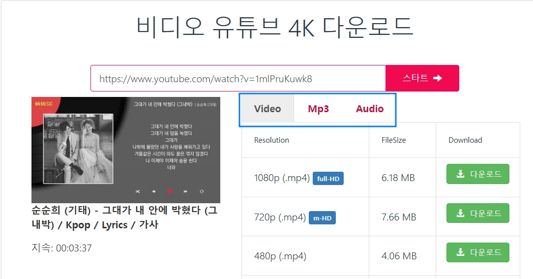2. 사이트에서 붙여 넣기를 한다. 비디오, mp3.Audio 중에서 원하는 것을 클릭한후 다운로드.