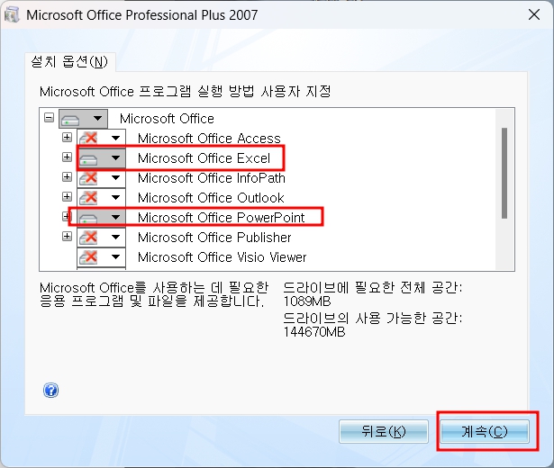 13. 원하는 것은 활성화를 시키고 원하지 않는 프로그램은 사용할 수 없음으로 눌러 빨간 엑스가 나오도록 설정한 후 계속을 눌러봅니다. 저는 엑셀과 파워포인트만 설치해 보겠습니다.