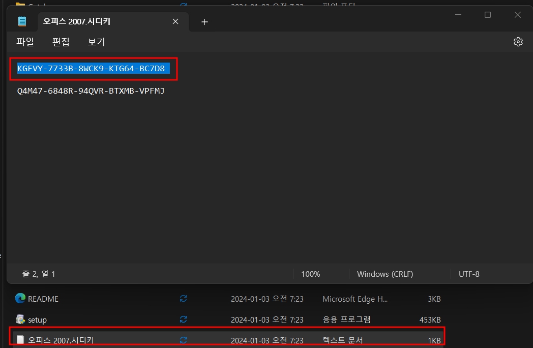 9. 위나 아래 둘 중의 키를 하나 선택해서 복사(컨트롤 c)를 한 후 제품키 입력란에 붙여 넣기 해줍니다.