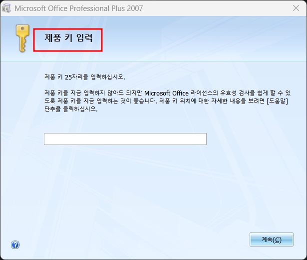 7. 제품키를 입력하고 나오면 제품키 입력을 하라고 하며 공백란이 나옵니다.