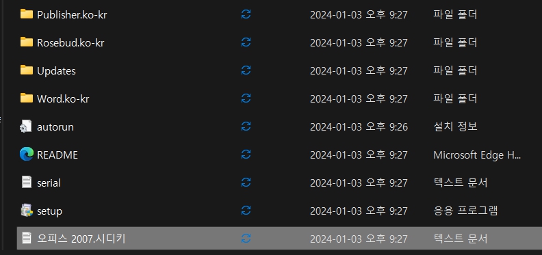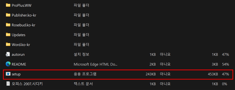 8.setup파일이 있었던 폴더로 되돌아가보면 바로 아래 오피스 2007. 시디키가 보입니다. 클릭해 봅니다.
