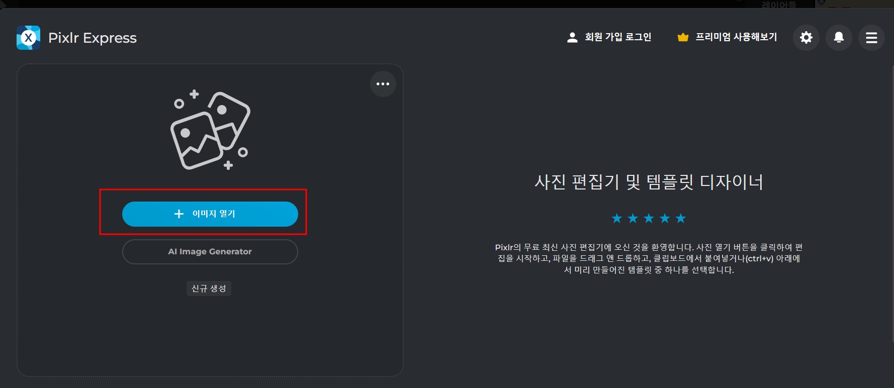 픽슬러 홈페이지를 들어가면 바로 이미지 열기 화면이 나옵니다. 이미지 열기를 통해 누끼 따기를 해야 하는 이미지를 업로드합니다.