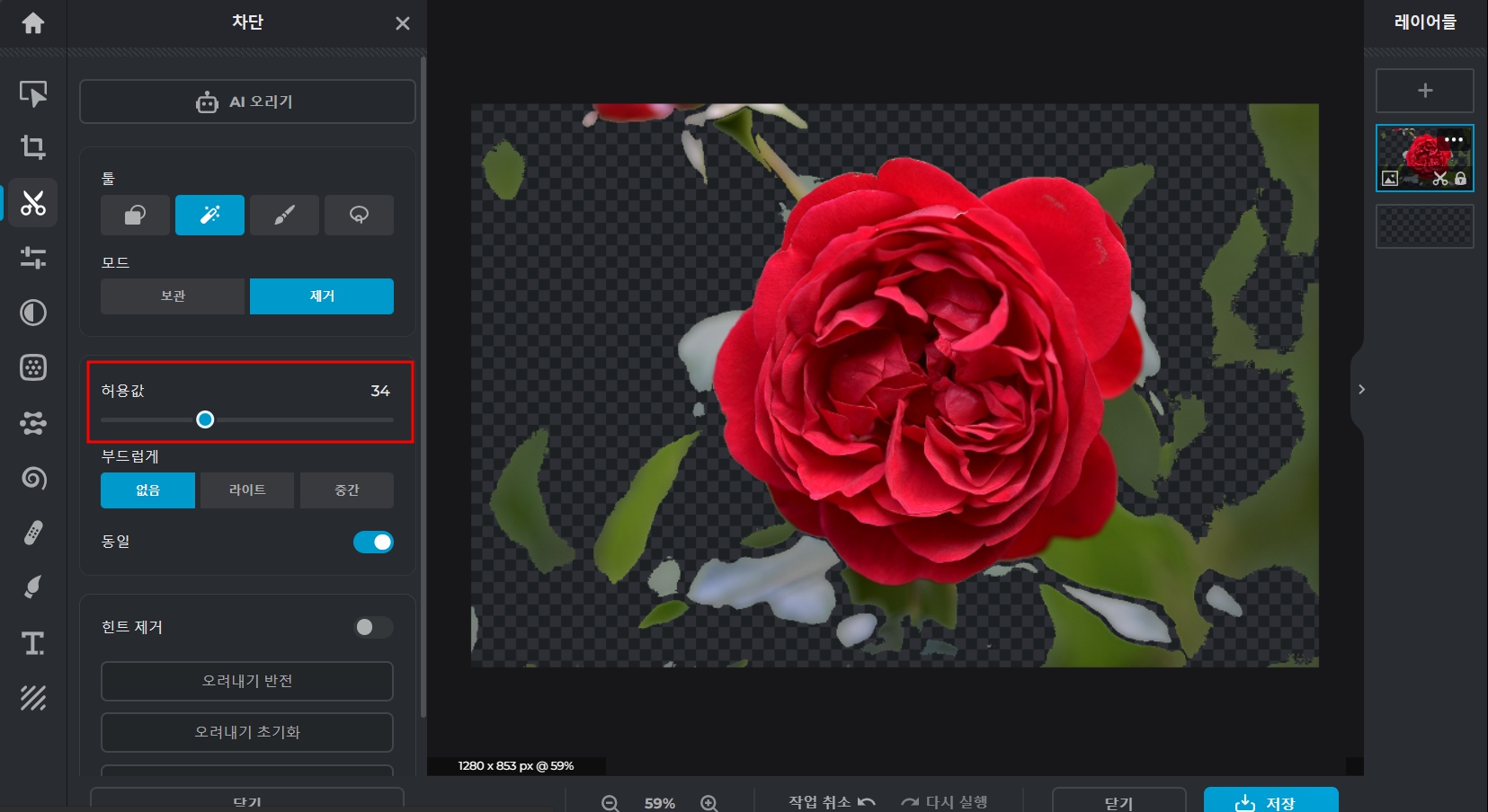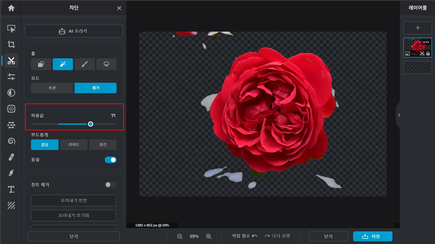 허용값의 크기에 따라서 제거되는 배경의 양이 달라집니다. 남아있는 배경은 클릭클릭을 여러 번 하여 마저 제거해 줍니다.