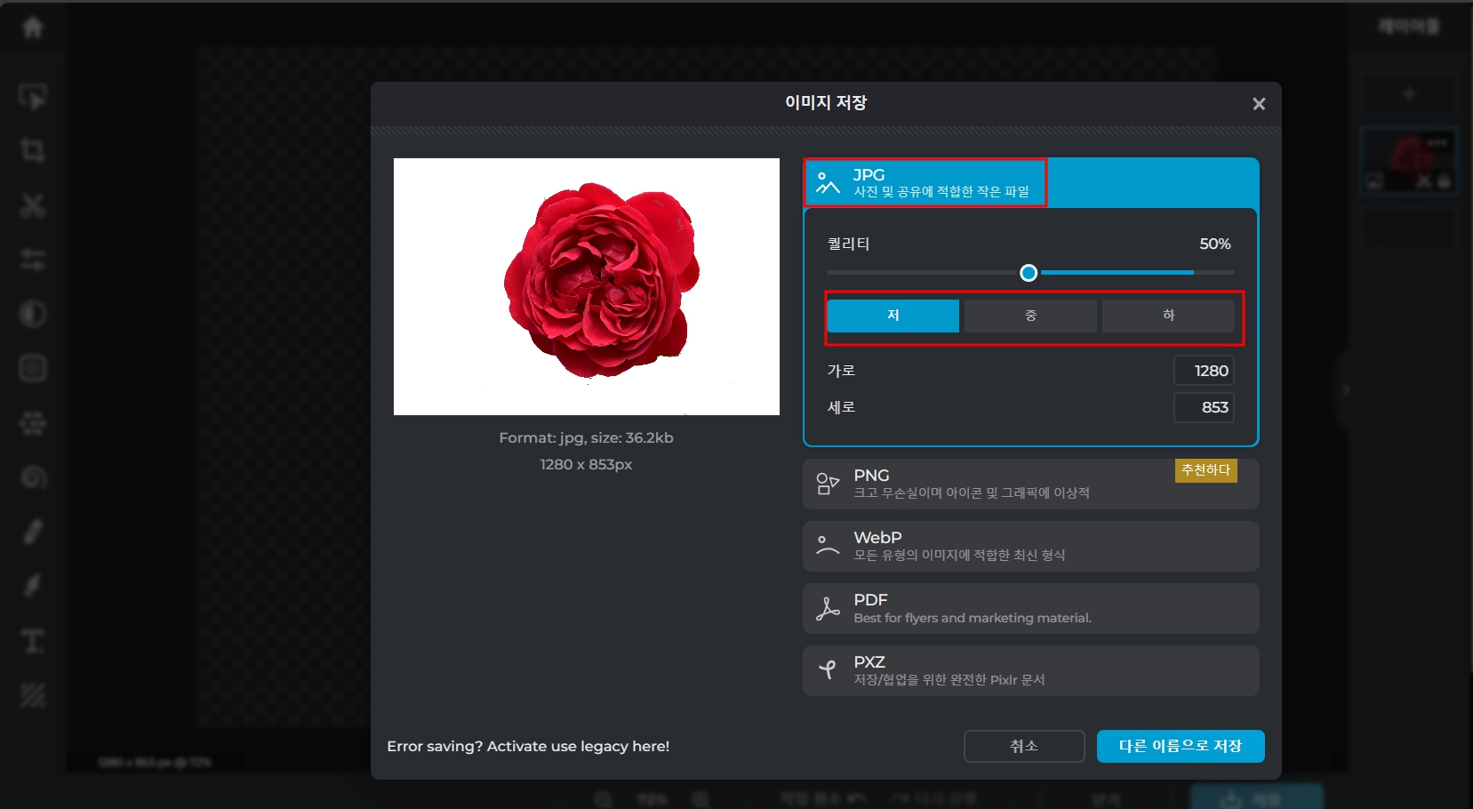 원하는 형태의 파일을 선택한 후 다른 이름으로 저장해 주면 끝이 납니다. 픽셀로 아주 간단하게 누끼 따는 사이트를 이용하여 배경화면을 지울 수 있습니다만, 픽슬러의 경우에는 3장 이상의 사진을 사용하면 유료결제를 해야 하므로 크롬브라우저를 이용해서 다시 픽슬러를 재사용하는 방법이 있습니다. 누끼 따는 사이트를 제대로 알고 있으면 누끼 따는법 아주 쉽습니다. 즐겨찾기 해두시면 편합니다.