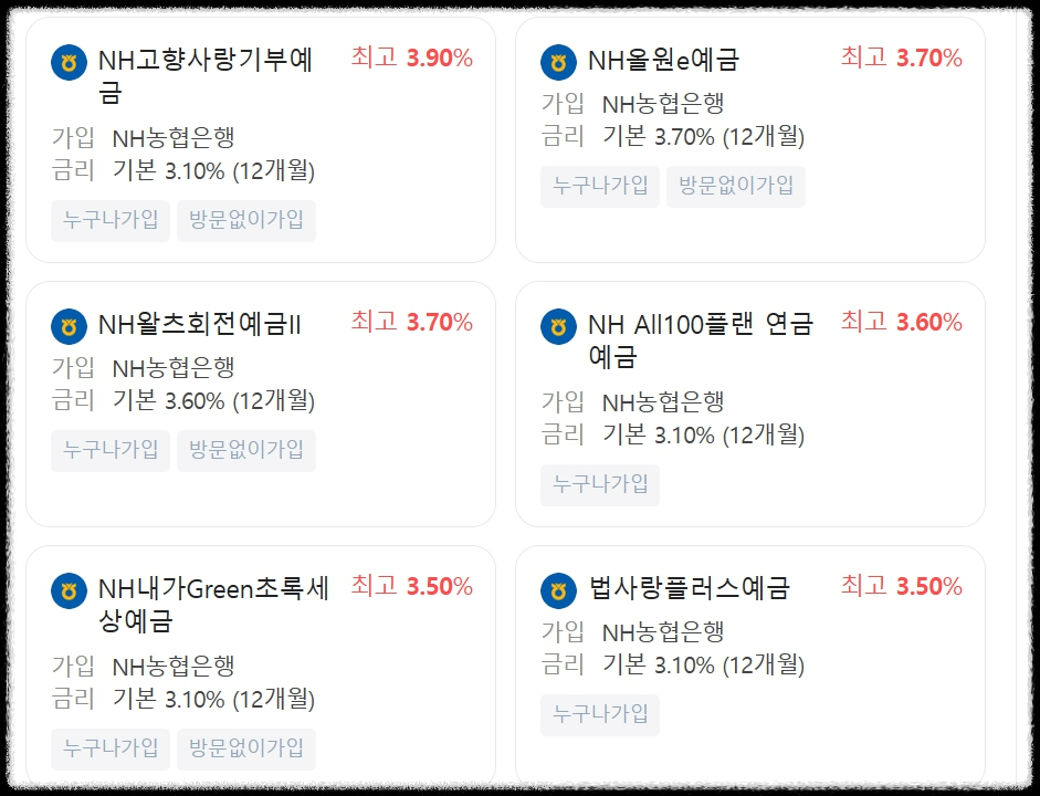 이 중 최고 금리는 3.9%로, 농협은행의 정기예금 'NH고향사랑기부예금'이 차지하고 있습니다. 이 상품은 가입 기간이 12개월이고, 가입 금액은 100만 원 이상입니다. 다음으로 높은 금리는 3.7%로, 농협은행의 정기예금 'NH 올원 e 예금'이 차지하고 있습니다. 이 상품은 가입 기간이 12개월이고, 가입 금액은 100만 원 이상입니다. 농협은행의 예금금리는 시중 은행 중에서는 높은 편에 속합니다. 특히, 3.5%의 최고 금리는 시중 은행 중에서 가장 높은 수준입니다. 따라서, 만기가 돌아오는 고금리 예금과 적금을 재예치할 계획이라면 농협의 예금 상품을 고려해 볼 수 있습니다.