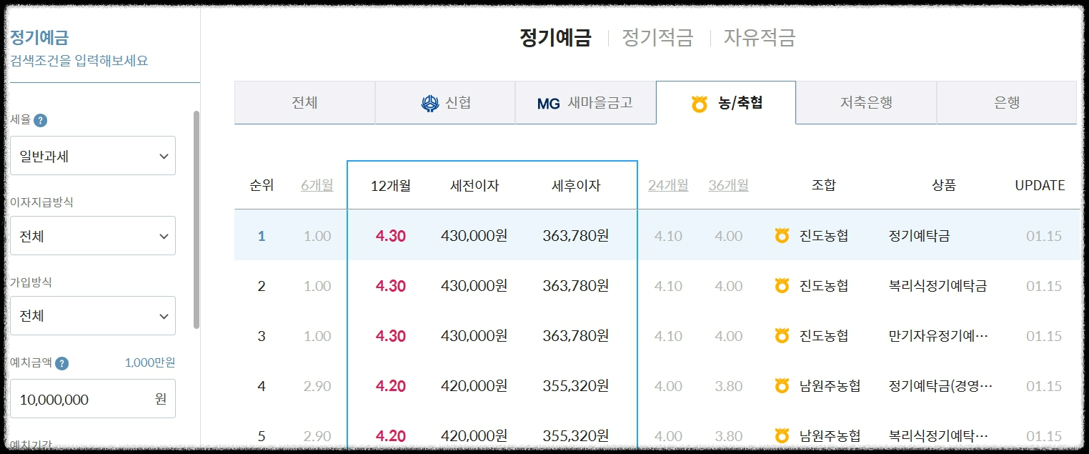 오늘 가장 중요한 농협예금금리 정보입니다. 농협은 각 지역마다 지점이 엄청나게 많으며 지점별로 이자율이 차이가 납니다. 모든 농협지점에 해당되는 사항이 아니라서 아쉽기는 하지만 우리 동네 농협지점에서는 얼마 큼의 이자를 줄 수 있는지 확인하고 가입할 수 있는 방법이 있습니다. 아래의 링크를 통해서 확인이 가능하며 1월 현재 기준 진도농협에서는 예금이자가 12개월 기준으로 최대 4.3%까지 주는 지점도 있습니다.