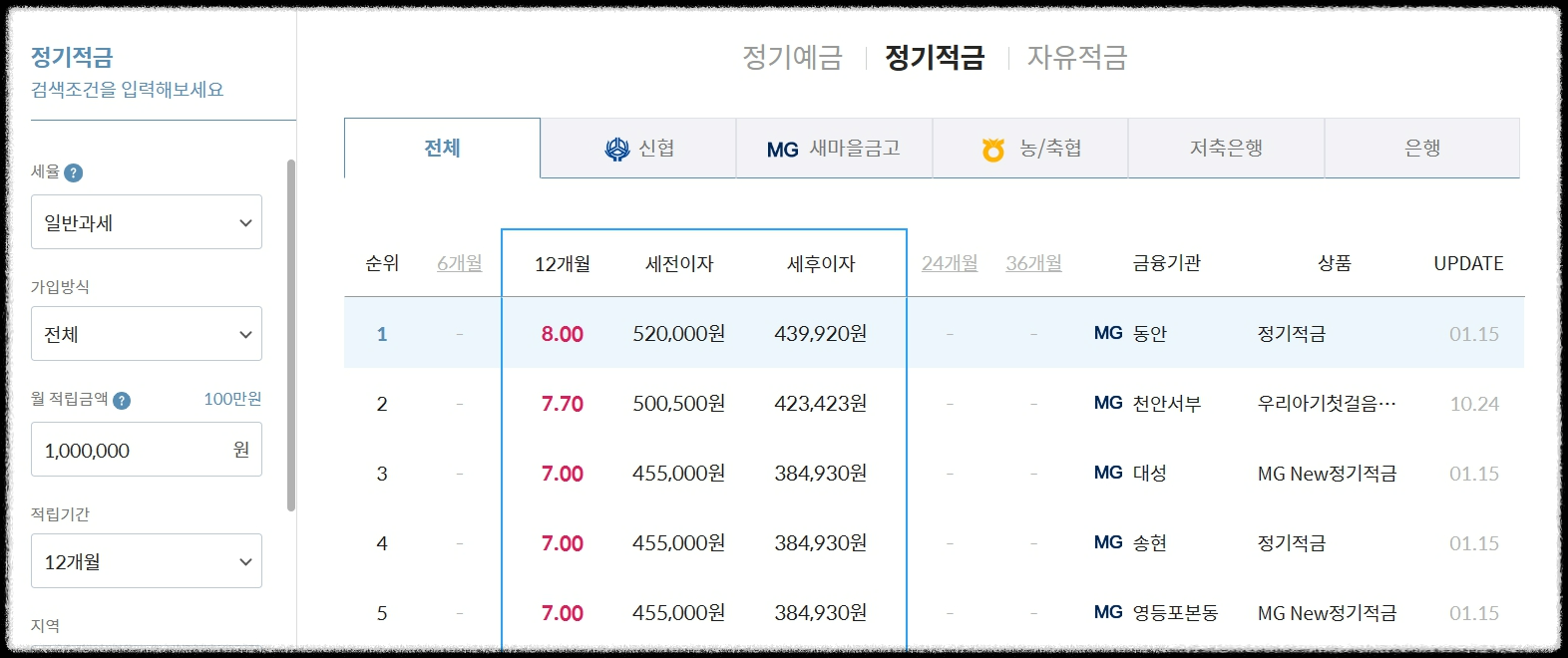 적립금 월 백만원 적립기간 12개월인 경우 정기예금 이자는 최대 4.3%, 정기적금의 경우에는 최대 8%입니다. 원금 1,200만 원 기준으로 세후 이자가 생각보다 적지 않은 금액입니다.