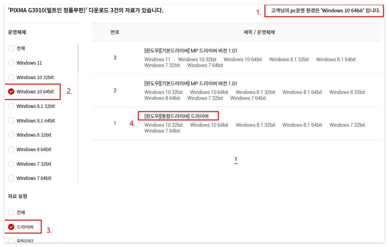 4. 오른쪽 상단 내 PC운영환경을 확인> 운영환경선택> 자료유형 드라이버선택> 통합드라이버선택