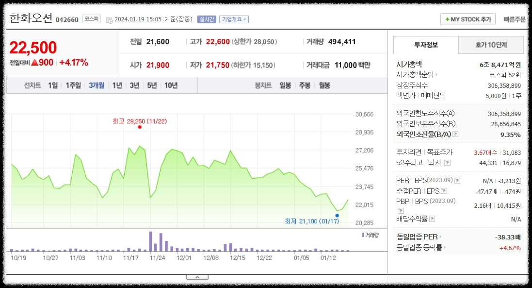 한화오션 주가 및 전망 빠르게 확인.