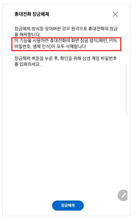 예전에는 스마트씽 파인드 서비스를 이용해 원격으로 잠금해제가 가능했습니다만 최근의 SmartThings Find 서비스 변경으로 인해 사용자들은 이전과는 달리 장치를 원격으로 잠금 해제하는 기능을 더 이상 활용할 수 없게 되었습니다. 이는 사용자들이 분실한 핸드폰에 대한 보안을 강화하기 위한 조치로 이해될 수 있습니다. 그러나 이러한 변경으로 인해 사용자들이 분실한 장치를 신속하게 찾고 잠금을 해제하는 데 어려움을 겪을 수 있습니다. 따라서 SmartThings Find 서비스를 이용하는 사용자들은 이러한 변경사항을 인지하고 분실 시에 대비하여 추가적인 보안 및 대처 방법을 고려해야 합니다. 사용자들은 분실 시에 대비하여 핸드폰을 원격으로 잠금 하는 기능 외에도 데이터를 백업하고 비상 연락처를 설정하는 등의 조치를 취할 필요가 있습니다.
