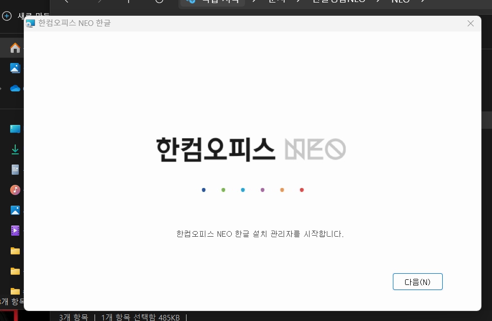 한컴 오피스 한글 설치 관리자를 시작합니다 화면이 나오고 다음버튼이 활성화되면 다음을 클릭합니다.