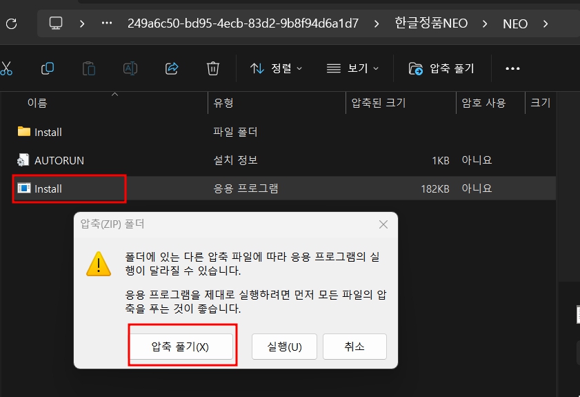 압축이 풀리지 않은 install파일을 압축풀기 한 후 실행을 해주기로 합니다.
