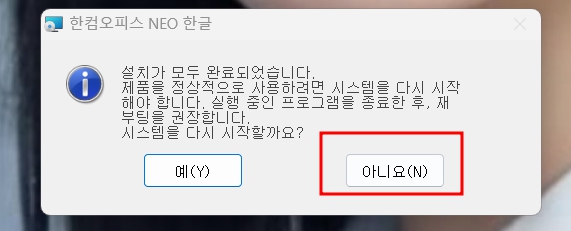설치가 모두 완료되면 재부팅을 권장하지만 아니요를 선택하시면 됩니다. 바탕화면에 한글 아이콘이 생성되었는지 확인이 되면 정확하세 설치가 되었으니 실행해 봅니다.