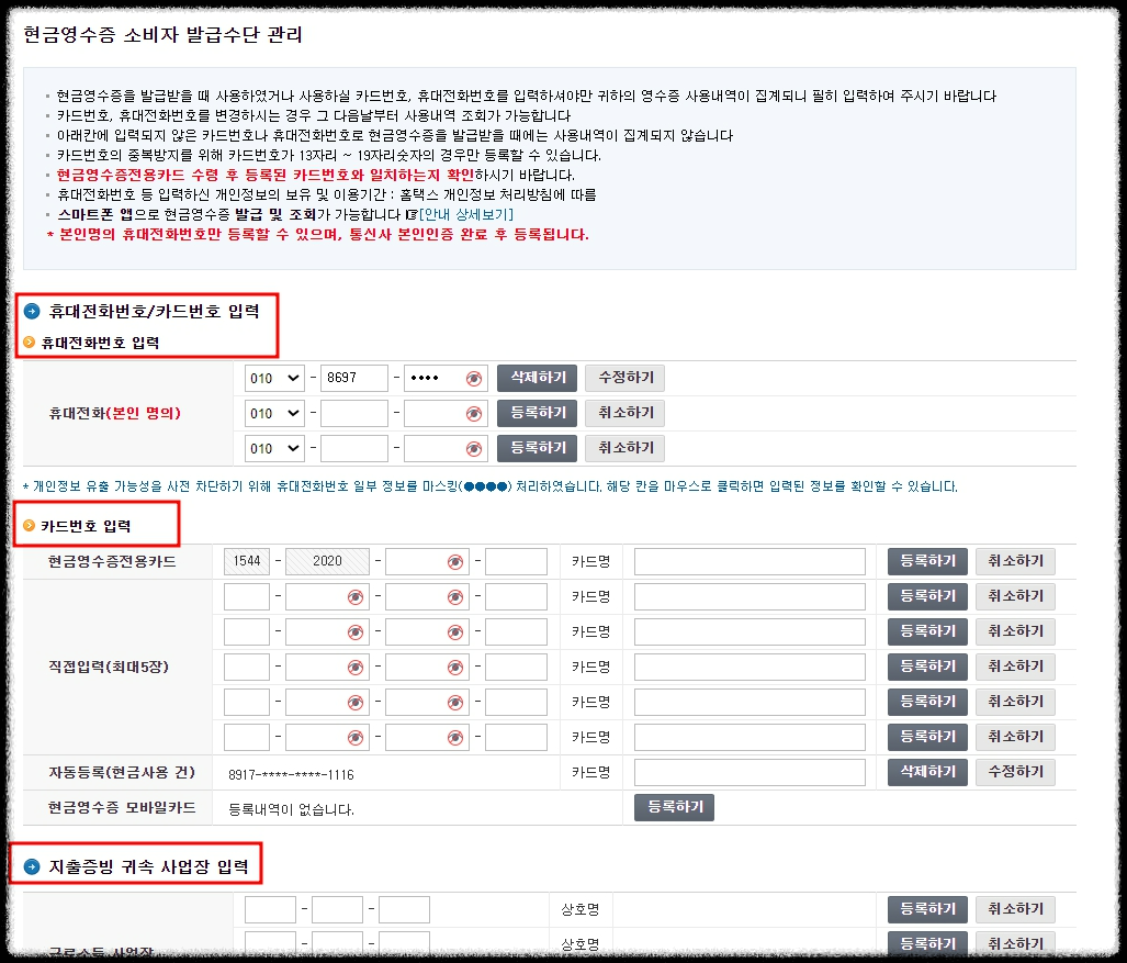 - 휴대전화입력 또는 카드번호입력 또는 지출증빙귀속사업장입력을 합니다.