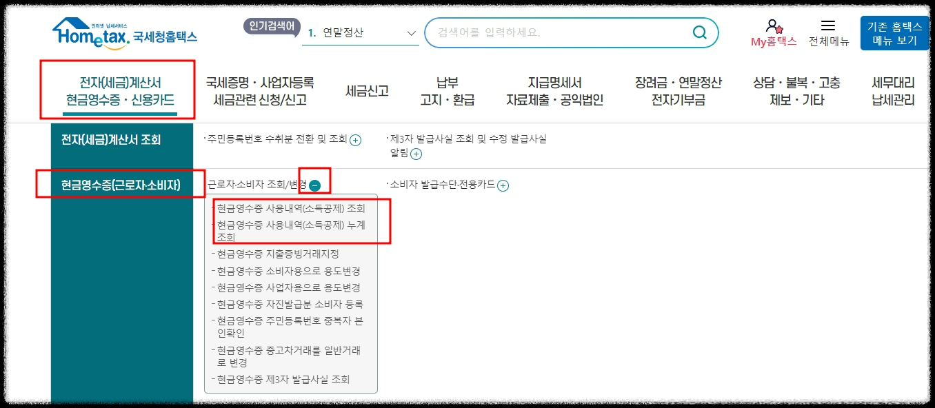 홈택스> 전자계산서, 현금영수증, 신용카드> 현금영수증(근로자, 소비자)>+선택> 현금영수증사용내역 조회