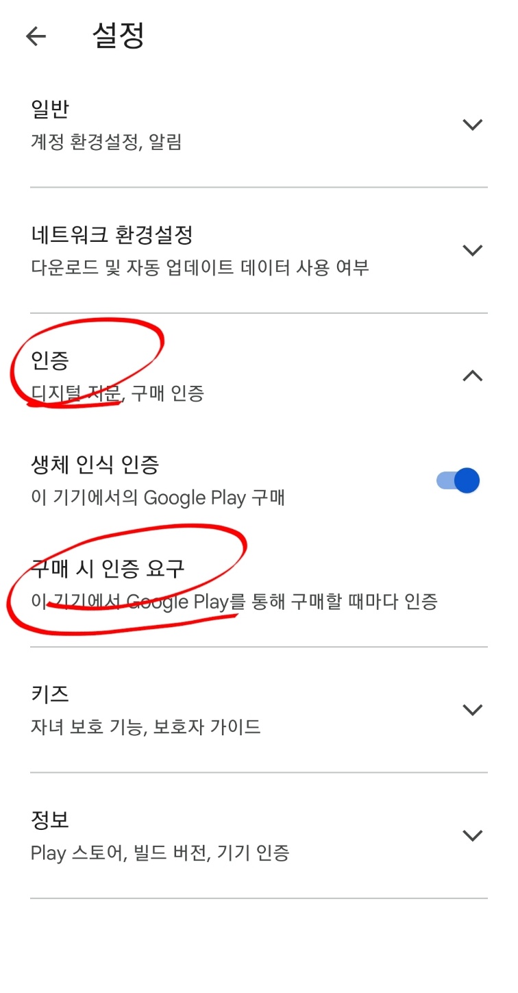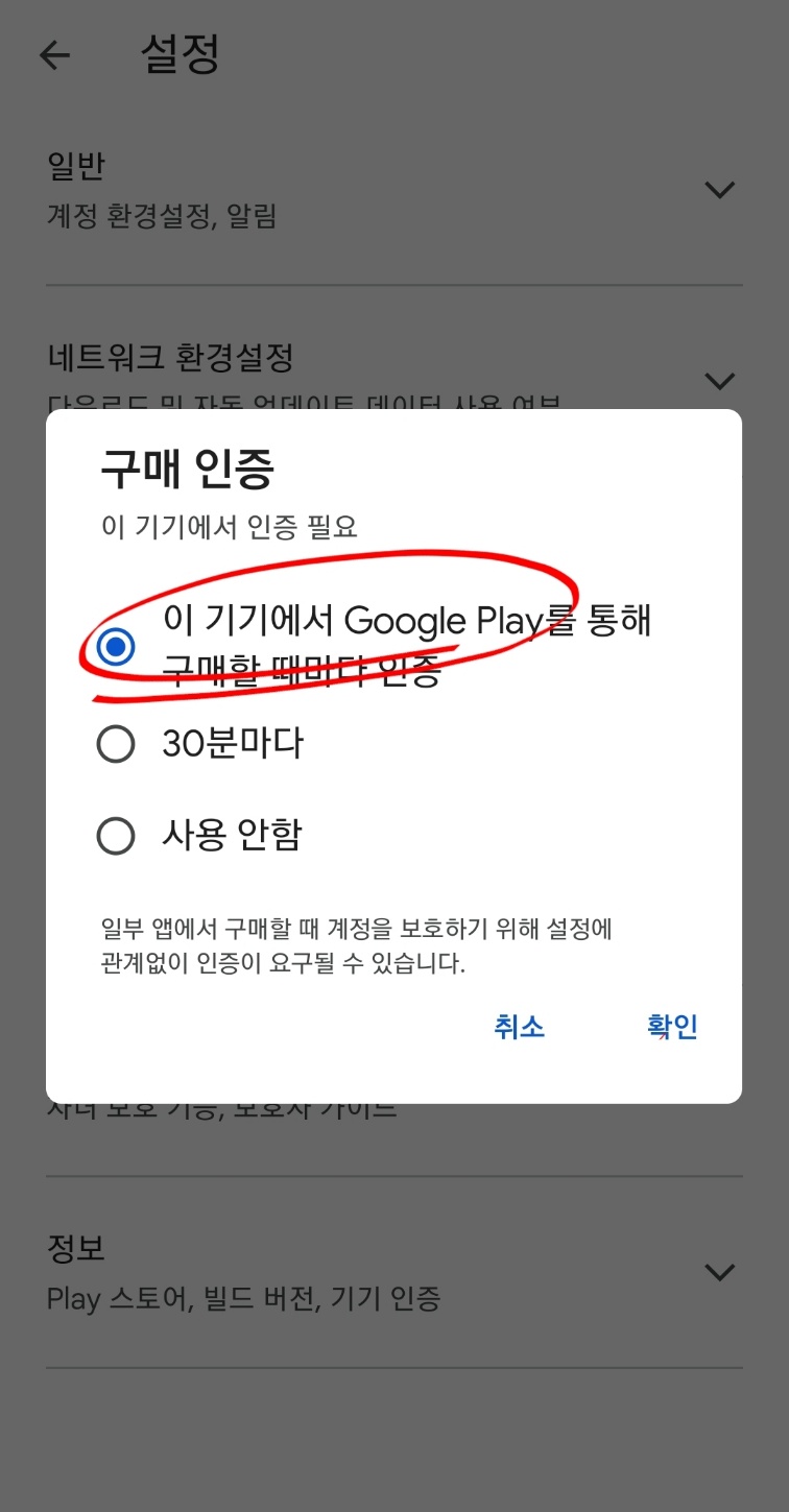 - 이기기에서 구글 플레이를 통해 구매할때마다 인증을 선택 후 확인