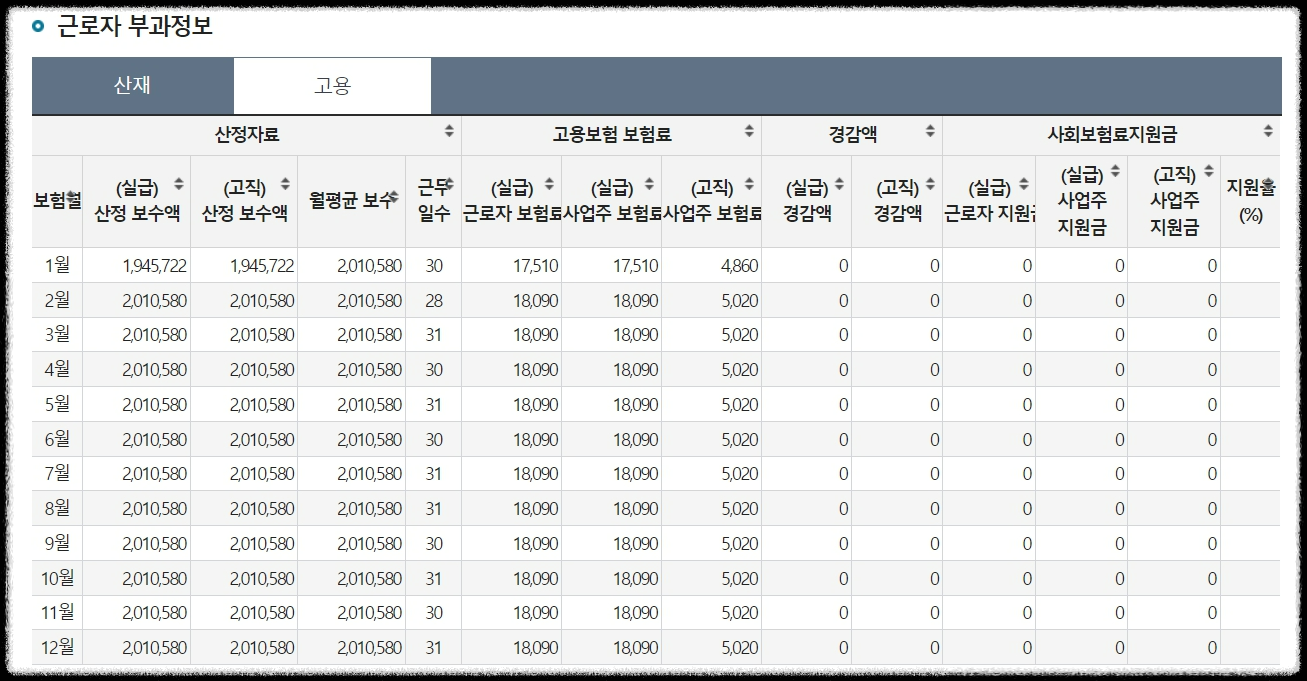 근로자 부과정보에서 산재와 고용으로 나누어져 있으니 고용을 선택한후 검색해봅니다. 월평균 보수/근무일수/근로자보험료/사업자보험료 순서대로 나와있습니다. 저는 최저임금을 받고 있어서 금액이 얼마되지 않습니다만 적은 금액을 내고 큰 혜택을 받을수 있는 아주 중요한 보험입니다.