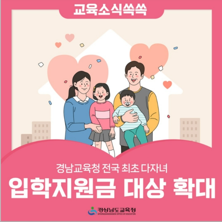 - 경남 각급학교(유치원제외)에 재학 중인 두 자녀 이상 가정 1학년 신입생 자녀(2024.3월 기준 재학 중이여야 함.)