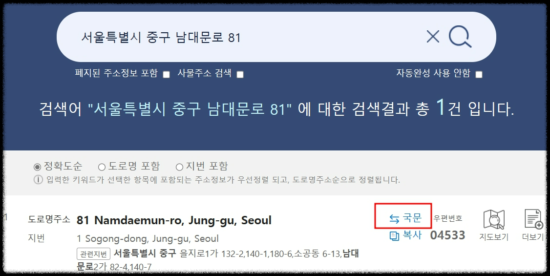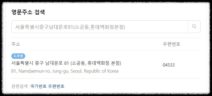 - 영문주소 검색이 나오면 한글주소를 입력하고 영문주소 결과를 볼 수 있습니다.
