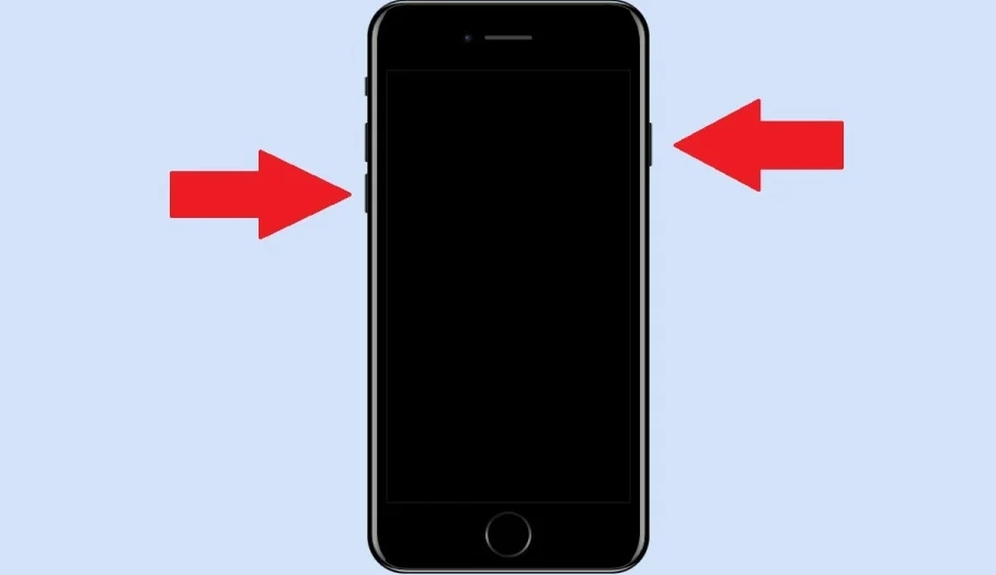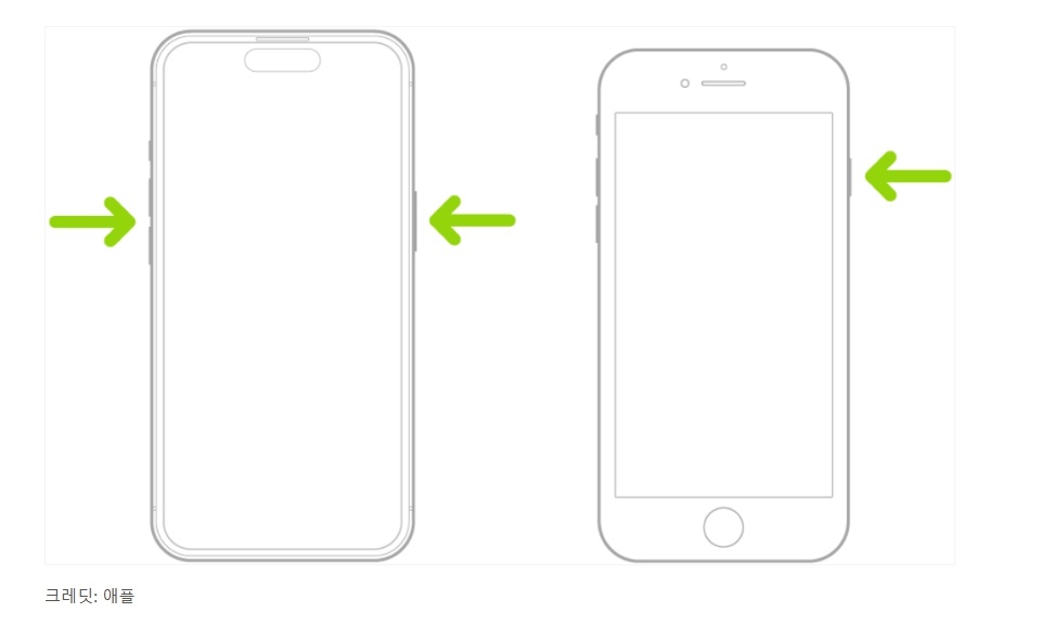 오른쪽 잠금 버튼과 왼쪽 음량 버튼 중 하나를 동시에 길게 누르기