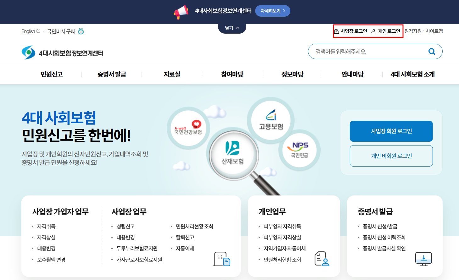 - 4대사회보험정보연계센터에서 로그인을 한다.