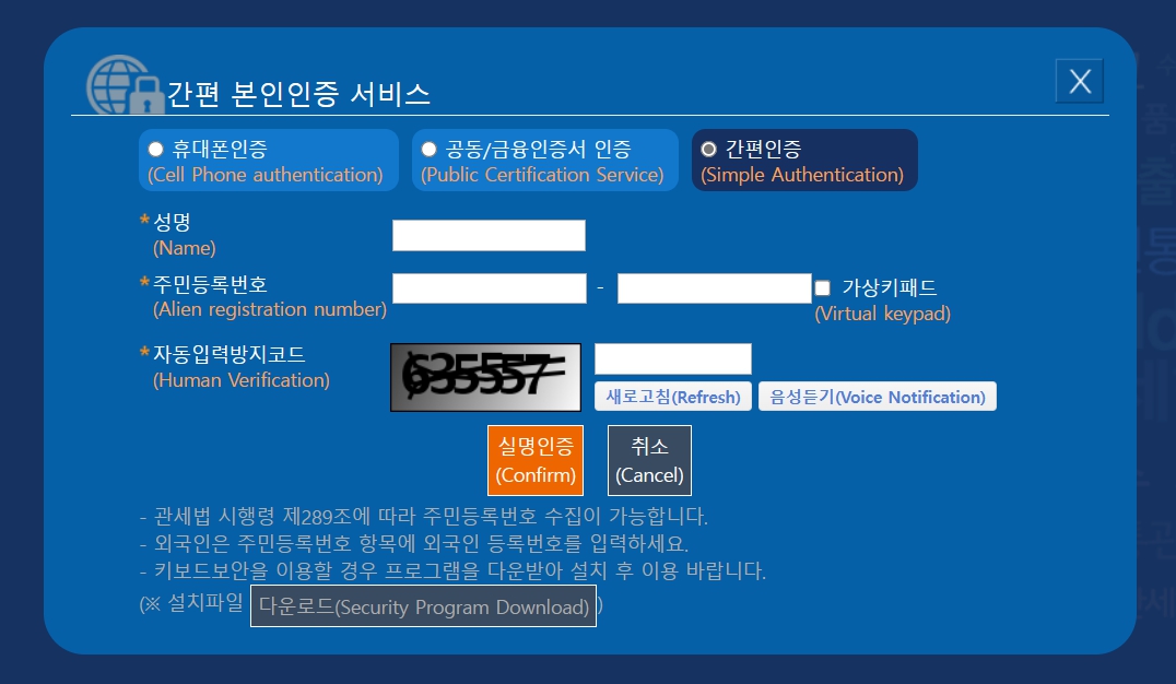 관세청 개인통관고유부호 조회방법도 위와 같습니다. 검색사이트에서 관세청에 접속 후 나타나는 조회창을 클릭한후 간편 인증을 하시면 다른 과정 필요 없이 나의 개인통관고유부호 조회가 가능하답니다. 아주 간다 하고 쉽죠?